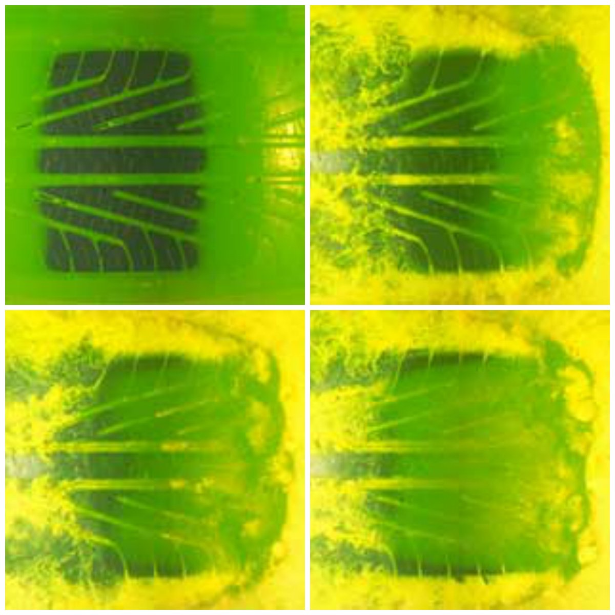 Bottom left photo: Same tire, under-inflated to only 30 psi driving across the same depth of colored water. Notice the poor tread footprint, showing smaller contact with the center of the tire's tread being lifted as the design unsuccessfully attempts to evacuate the water.